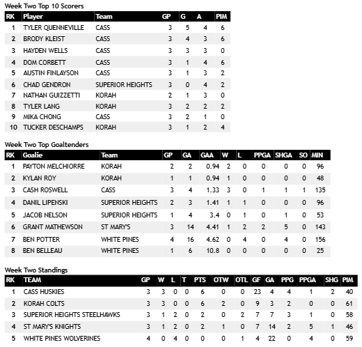 As we head into week two of the 2024 – 2025 Sault Ste Marie High School Hockey League, several players have already made their mark on the score sheets. Leading the pack in goals is Huskie Tyler Quenneville from Central Algoma, with an impressive five goals and three assists in just three games. Close behind is Huskies Brody Kleist from Central Algoma, who has tallied four goals and three assists, showcasing his all-around offensive game. In net, Colts goaltender Payton Melchiorre from Korah Collegiate has been nearly unstoppable, boasting a .940 save percentage in two regular season games. The league standings are starting to take shape, with the CASS Huskies sitting atop the leaderboard at 3-0, followed closely by Korah Colts with a 3 – 0 record while both the Superior Heights Steelhawks and St Mary’s Knights, both with strong 1-2 records. The White Pines Wolverines sit in fifth with a 0 – 3 record after week two action. As the season heats up, these top scorers and goaltenders will be pivotal in shaping the playoff race.